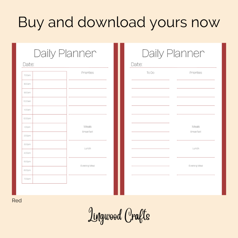 Within this purchase is the daily planner in 2 different styles in 5 different colours each for you to choose from and print as and when necessary.